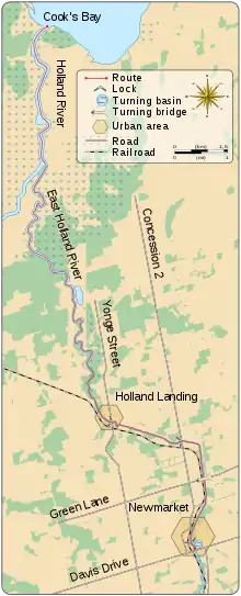 The canal route starts on the eastern arm of the Holland River, which splits off of the western arm just south of Cook's Bay. The eastern arm runs roughly southward through River Drive Park and into Holland Landing on the west side of town. At the southwestern corner of town it turns to the southeast, and after a short distance reaches the first lock, now under the bridge carrying "old" Yonge Street into town.[lower-alpha 10]