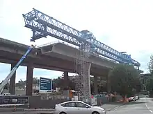 The new structure was to be constructed in a way to minimally affect the traffic flow on this crucial motorway link, by first constructing a new viaduct of four southbound lanes to the north-east of the existing structure, then demolishing the existing three southbound lanes, before constructing the three new northbound lanes in the gap and finally demolishing the three old northbound lanes. It was originally considered whether to build a 'steel box' or a 'concrete box' structure, though both would look similar to the existing viaduct structure.[5][8] It was eventually decided to construct a segmented structure built from 468 pre-cast concrete sections constructed off-site in East Tāmaki, and moved into place with a lifting gantry truss.[9]