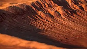 The impact that formed Newton likely occurred more than 3 billion years ago. The crater contains smaller craters within its basin and is particularly notable for gully formations that are presumed to be indicative of past liquid water flows. Many small channels exist in this area; they are further evidence of liquid water. On the basis of their form, aspects, positions, and location amongst and apparent interaction with features thought to be rich in water ice, many researchers believed that the processes carving the gullies involve liquid water. However, this remains a topic of active research. As soon as gullies were discovered,[2] researchers began to image many gullies over and over, looking for possible changes. By 2006, some changes were found.[3] Later, with further analysis it was determined that the changes could have occurred by dry granular flows rather than being driven by flowing water.[4][5][6] With continued observations many more changes were found in Gasa Crater and others.[7] With more repeated observations, more and more changes have been found; since the changes occur in the winter and spring, experts are tending to believe that gullies were formed from dry ice. Before-and-after images demonstrated the timing of this activity coincided with seasonal carbon-dioxide frost and temperatures that would not have allowed for liquid water. When dry ice frost changes to a gas, it may lubricate dry material to flow especially on steep slopes.[8][9][10] In some years frost, perhaps as thick as 1 meter.
