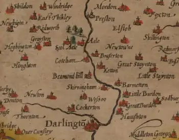 A map of Aycliffe and its surrounding area c. 1611, extracted from a map of County Durham by John Speed. The name "Aycliffe" is rendered as "Acle". In the above, "Acle" is the original village of Aycliffe, and "Scol Acle" is School Aycliffe ("School" in the village's name being derived from "Scula", a Viking chieftain that was granted lands in the area). The location of Newton Aycliffe is shown on the map as a forested area to the north of these two villages. (Click here for the entire map)
