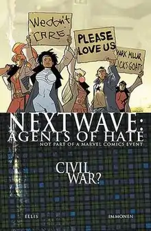 ![]() Nextwave #11, art by Stuart Immonen. The cover parodies Marvel's Civil War. | |