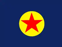 Ngaraard recently changed its flag. It is made of a golden-yellow star on a field of deep sky blue. Behind the star, it has a red stripe from the bottom left corner to the upper right corner of the flag. The star stands for the unity of Ngaraard State, and the five fingers of the star stand for the five counties or hamlets of Ngaraard. The stripe of the flag shows that the state has both the east and west coast of northern Babeldaob and is striving for success. The blue background symbolizes the blue of the sky and ocean surrounding the Ngaraard State.