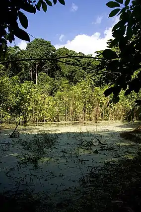 The reserve includes several biomes, including tropical forest, riverine forest, and maquis shrubland. Some plants found in the area are Odyendea zimmermanni, Uapaca guineensis, Antiaris toxicaria, Elaeis guineensis, Erythrophleum suaveolens, Pachystela brevipes, Bombax rhodognaphalon, Quassia undulata, and Croton sylvaticus.[2] Riverine forest mostly comprises Barringtonia racemosa and Samadera indica, as well as Raphia and Anthocleista where swamps are found.[2] Shrubland is mostly found on the Tondooni peninsula, and its vegetation includes Sorindeia madagascariensis, Diospyros consolatae, Tamarindus indica, Afzelia quanzensis, Terminalia boivinii, Cussonia zimmermannii, and Olea woodiana.[2]