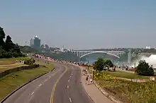 The Niagara Parkway travels alongside the Upper Rapids and passes adjacent to Horseshoe Falls.[4] It crosses through Queen Victoria Park and enters downtown Niagara Falls, where it is known as River Road north of Clifton Hill. The parkway passes below the Rainbow Bridge; side streets provide access to Highway 420, but River Road itself does not meet it. As the road progresses north, it passes beneath the Whirlpool Rapids Bridge before wrapping around the Whirlpool Rapids. At Victoria Avenue, River Road becomes the Niagara Parkway again.[6] The parkway passes the Butterfly Conservatory and crosses the Sir Adam Beck Hydroelectric Power Stations.[3] Shortly thereafter, it passes by the Niagara Floral Clock, one of the largest floral clocks in the world with a diameter of 12.2 m (40 ft).[4] It passes beneath Highway 405 at the Lewiston–Queenston Bridge; the Parkway's interchange with Highway 405 was removed by December 2006.[7]