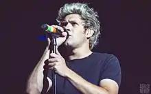 Horan's brother received a guitar for his 15th birthday which he only used once and then it "sat around for a while" until Horan himself picked it up.[11] Horan, then aged 11, taught himself how to play the guitar by following YouTube tutorials. His aunt discovered his abilities one day when she was in the car with Horan as he started singing, and she had initially thought that the radio was on.[12] As a teenager, he performed at the Mullingar Arts Centre during a fund-raiser for the local football team, the Shamrocks. He also bagged a support slot with former X Factor contestant Lloyd Daniels at the Academy club in Dublin.[13]