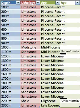 The lowest and oldest sequence consists of rocks that date to around the late Eocene. These rocks include pyritic shales, dolomitic limestones, and calcareous mudstones.[1] Above these rocks lie various volcanoclastic sandstones and claystones from the early Oligocene.[1]