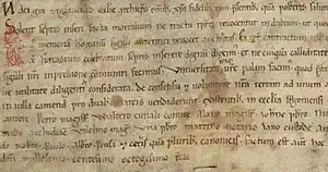 Nicholas was elected Archbishop of Esztergom following the death of Lucas, the most influential prelate in the 12th-century Hungary.[6] Nicholas first appears as archbishop in a royal document of 1181, when Béla returned fleeing serfs to the Cégény Abbey in accordance with the verdict of Farkas Gatal, Palatine of Hungary. Nicholas crowned the eight-year-old prince Emeric king on 16 May 1182, which confirmed Emeric's right to succeed his father, according to the narration of French chronicler Geoffroy du Breuil.[4] Nicholas is the first archbishop, whose own charter was preserved. Accordingly, the Esztergom Chapter sold a portion of land in Kéménd (present-day Kamenín, Slovakia) to Farkas Gatal for two marks in 1183.[7] The document contains the phrase "sigillum authenticum" (official authentic seal), which guaranteed systematically the contractants' transactions recorded in writing. Pope Alexander III distinguished that type of document from private seals in 1166, beginning with his papal decretals.[7] The permanent royal chancellery also emerged during the brief bishopric of Nicholas. Whether he was a promoter of court reforms, it is not known. Nevertheless, Béla separated the issuance of royal charters from the court clergy with that step after the experience of his long lasting jurisdictional conflicts with the strong-willed Lucas.[8] Nicholas died either in 1183 or 1184, as his successor Job appears as archbishop since 1185.[6]