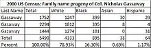 As of the Census of 2000, there were 5599 persons in the United States named Gassaway, Gasaway, Gasway or Gazaway. Of those roughly 79% were identified as white, 16% African-American, 1% Hispanic and less than 1% Asian-American.[2]