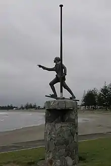 On 10 October 1969, a bronze statue of Nicholas Young was unveiled by Governor-General Sir Arthur Porritt at Churchill Park on Waikanae Beach, Gisborne as part of the Cook Bicentenary Celebrations.[7] The monument, sculpted by Frank Szirmay, depicts Young pointing towards the white cliffs of Young Nicks Head.[8][9]