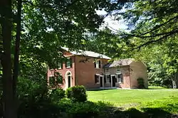 The Nichols–Sterner House is located in a rural setting of northern Richmond, on the north side of Swamp Road, a historically major road connecting Pittsfield and West Stockbridge. It is a 2+1⁄2-story brick building, with a gabled roof and a south-facing facade. The facade is three bays wide, with the main entrance in the right bay, framed by pilasters and topped by a keystoned round-arch transom window. The gable above is fully pedimented, with a keystoned half-round window at its center. A contemporaneous 1+1⁄2-story brick ell extends to the right from the rear corner. The interior retains original Federal woodwork, including fireplace mantels, doors, and trim. The main hall's trim has been given a marbleized finish, and its walls are painted with scenes of the Erie Canal. This artwork is the work of Albert Sterner, the second occupant of the house.[2]
