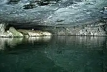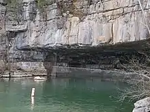 Nickajack Cave is a large, partially flooded cave in Marion County, Tennessee. It was partially flooded by the Tennessee Valley Authority's Nickajack Lake, created by the construction of Nickajack Dam in 1967. The entrance was originally 140 feet wide and 50 feet high.[1] There is now about 25–30 feet of water at the entrance, so the portion of the entrance above water is 140 feet wide and 20–25 feet high. It houses a large colony of gray bats, an endangered species, and the water levels have posed a danger to the bat colony.[2] The cave took its name from the Chickamauga Cherokee town of Nickajack,[3] located between its mouth and the Tennessee River. The town was once attacked and destroyed in 1794 by the Nickajack Expedition.