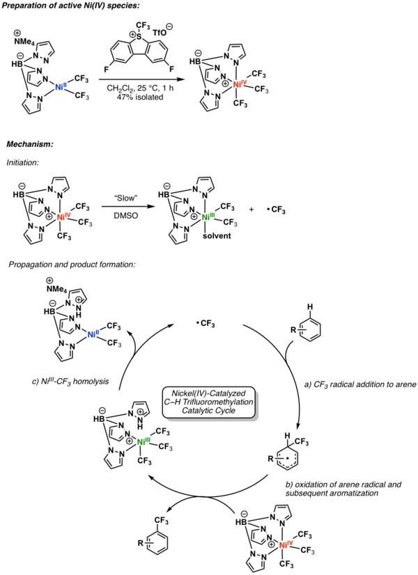 - ↑ D'Accriscio, Florian; Borja, Pilar; Saffon-Merceron, Nathalie; Fustier-Boutignon, Marie; Mézailles, Nicolas; Nebra, Noel (2017-09-06). "C−H Bond Trifluoromethylation of Arenes Enabled by a Robust, High-Valent Nickel(IV) Complex". Angewandte Chemie International Edition. 56 (42): 12898–12902. doi:10.1002/anie.201706237. ISSN 1433-7851. PMID 28815889.