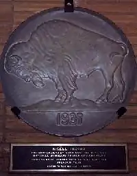 Robert Kunkel, a UND alumnus and Chicago advertising executive, was the originator of the trophy, and Blue Key, an honorary service fraternity at NDSU, and the UND Blue Key (Student Government after their Blue Key Chapter dissolved) administered the annual awarding. It is an oversized 75-pound replica[1] of the James Earle Fraser-designed U.S. buffalo nickel with a buffalo on one side representing NDSU Bison and a Native American head on the other side representing UND, who were known as the Fighting Sioux until 2012. Fraser, best known for his sculpture, "The End of The Trail", was born in Winona, MN and lived for a time in Dakota Territory. The coin-shaped trophy's "mint" date is 1937, the year the trophy was created. Jack Sather, a native of New England, ND, was commissioned to design and act a sculpture of the award. It took six weeks to complete the job and he was paid $1,650 for his work. Those funds were raised by both NDSU and UND Blue Key chapters from members and friends. The Nickel, at 250 times larger than a regular five-cent piece, weighs 75 pounds and is 2 inches thick and 22 inches in diameter. Both sides were 3/4" relief and, from the original models, plaster casts were poured. The casts were hauled to a St. Paul, MN foundry where plaster copies were recast in an aluminum alloy. The halves were welded together to make the finished piece. It was first awarded in 1938 when NDSU won 17–13. It has been the object of many theft and "kidnapping" attempts by students from both universities. Governor William Langer was asked to participate in the unveiling of the new award in Grand Forks. Moments after the unveiling an unidentified student stepped up to Governor Langer, told him "I'll take care of this for you", and disappeared with the nickel trophy. It turned up 36 hours later on the front lawn of then UND President John C. West (The Forum of Fargo-Moorhead, October 21, 1967) and a new tradition of "kidnapping" or "borrowing" the trophy had begun. The Trophy retired after the 2003 season. Upon renewal of the "rivalry" games being played in 2015, the trophy remains retired and is currently displayed at the North Dakota Heritage Center in Bismarck.