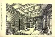 The Nickerson House was designed by one Chicago's earliest prominent architects, Edward J. Burling (1819–1892) of Burling and Whitehouse.[3] In addition, three decorators were contracted for the interiors: William August Fiedler (1843–1903) and R. W. Bates & Co. of Chicago, and New York-based George A. Schastey & Co. The three-story, 24,000 square-foot Nickerson House was reported to be the largest and most extravagant private residence in Chicago at the time of its completion. (This distinction would be transferred to the Palmer Mansion on the Gold Coast several years later.) Nickerson spared no expense, spending $450,000 on the construction and decoration of his home.[4]