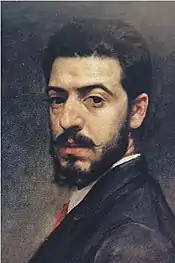 From 1872 to 1878, he studied in Rome with Marià Fortuny and at the Accademia Chigi, where he was influenced by the Macchiaioli. He then went to Paris and worked with Jean-Louis-Ernest Meissonier until 1880.[1] By this time, he was already very popular with art dealers. His works were distributed throughout Europe and North America by a German firm. In 1880, he participated in the Salon, presenting his historical genre work "Laboremus" at a time when most of the exhibitors were impressionists.