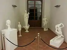 There are also the allegorical figures: "Justice" (bronze bas-relief openwork), "Lady Luck", "Woman with a dove" (plasters), "The winged horse" (a bronze), and finally, the religious themes, like "Mater Ecclesiae" (plaster) and the " Stations of the Cross" with four figures (bronze bas-relief).[5]