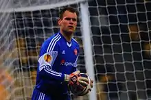 In the 2013–14 Danish Superliga season, his third season as the club's starting goalkeeper, he made 32 out of 33 possible appearances in the league, playing full time in all 32 matches.[26] In these 32 matches, Larsen also incurred one single warning in a match against Randers FC on 11 November 2013, which resulted in him receiving three suspension points.[27] In December 2013, he was voted second in Danish Goalkeeper of the Year awards by his fellow Superliga and 1st Division (second-tier) goalkeepers for 2013.[28] Larsen signed a four-year contract extension on 2 May 2014, keeping him at the club until 30 June 2018.[28][29][30][31] AaB would go on to win their fourth Danish championship in the 2013–14 season.[32][33] The title was secured on 11 May 2014, where AaB drew 0–0 away against FC Vestsjælland,[34] as FC Midtjylland lost 3–2 to Copenhagen,[35] which effectively made the club from Aalborg Danish champions.[36][37] AaB also won the Danish Cup this year, defeating Copenhagen in the final on 15 May 2014 to secure the Danish Double.[38]