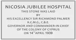 The decision for erecting a purpose built general hospital in Nicosia was taken during the British colonial administration of Cyprus in 1936.[1] It was inaugurated on 14 April 1939 by the then British governor Richard Palmer. This coincided with the breakout of World War II and many British and Cypriot soldiers were transported there, away from the front line, for recovery. Cyprus escaped the fighting, apart from the occasional German bombing raid.