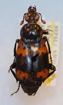 Nicrophorus nepalensis Hope, (Chinese: 尼泊爾埋葬蟲 or 橙斑埋葬蟲), commonly known as burying beetle, is widespread across tropical and subtropical countries in Asia. It belongs to the order Coleoptera and the family Silphidae, and is part of the nepalensis species-group, which is the second largest species group within the genus Nicrophorus.[1] N. nepalensis differs from some other beetles in that it exhibits biparental care. Its role as a decomposer is crucial in the energy cycle and energy transformation in the ecosystem.