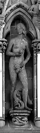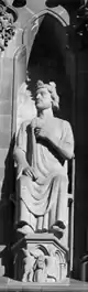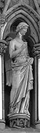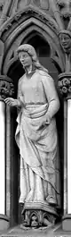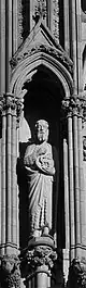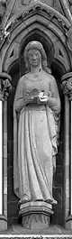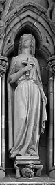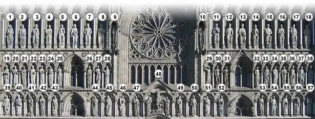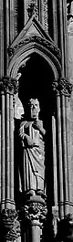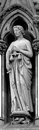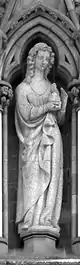 Middle row: the three theological virtuesOn the left side of the rosette-shaped window sculptures are three women, representing three theological virtues: Faith, Hope, and Love or Charity. These virtues provide the foundation for, as well as characterizing and encouraging, Christian morality. The theological virtues are related to the four cardinal virtues located on the right side of the cathedral's rose window. | |||||||