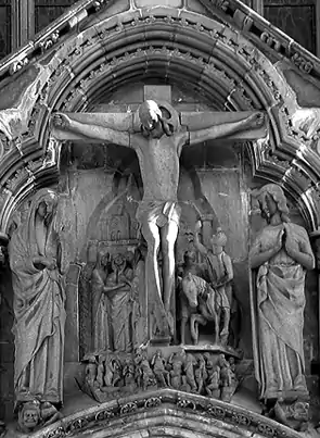 The central axis of the west front is dominated by Jesus Christ, to whom the Nidaros Cathedral is dedicated. Christ comprises the stem of a tree, and the rows of sculptures represent branches of the tree. At the bottom of the middle axis lies a sculpted group of motifs from the crucifixion - the crucified Christ is based on a model by Wilhelm Rasmussen. Above the rose window is a relief with the same theme as the window's subject – doomsday – with Christ sitting in judgment; the relief was designed by Stinius Fredriksen. At the top of the west gable is a relief with Christ triumphant - the transfigured Christ, designed by Kristofer Leirdalen. Danbolt discusses these sculptures in his works about Nidarosdomen, noting that: