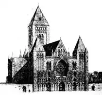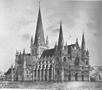 This part of the church is also the most recent of the original cathedral constructions; archbishop Sigurd Eindrideson laid the cornerstone for the west front in 1248. The construction was not yet complete when the church was burnt in 1328. The original design for the west face is not known, but one can assume that it was never built to those original plans; it is reasonable to assume that a screen front similar to that used elsewhere was planned on the west. Screen fronts were often rectangular and served as a cover to conceal the rest of the church. English cathedrals from the same period, among others Lincoln Cathedral, Wells Cathedral and Salisbury Cathedral, had similar fronts. The west front had three entrances and is flanked by two smaller towers on each side of the façade.[1]