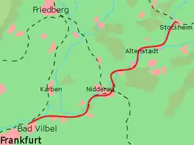 The Bad Vilbel–Glauburg-Stockheim railway (also called the Niddertalbahn—Nidder Valley Railway) is a non-electrified branch line in the Wetterau and the Main-Kinzig districts of the German state of Hesse. It connects the Main-Weser Railway in Bad Vilbel with the Gießen–Gelnhausen railway in Glauburg-Stockheim.