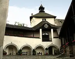 Although in large part only ruins remain of what used to be the Gothic castle in Niedzica, its dungeons and a number of rooms survived, as have some of the paintings — including the Crucifixion that once adorned the chapel — and furnishings which are not entirely as they were in the 1930s. The architectural design consists of a densely packed complex of buildings with a courtyard surrounded by residential wings with arcades, towers and fortified walls.