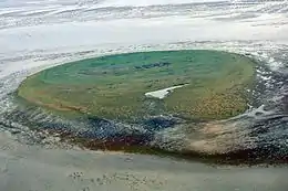 The newly constructed island measured 30 hectares (74 acres) in total area. As pioneer flora began to colonise the island, helping the pre-existing structures to hold down sediments, Nigehörn began to grow naturally into the surrounding tidal mudflats. In this manner, the area of the island has increased over time to approximately 50 hectares (120 acres).[1]