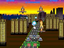 The player controls the car and shoots enemies encountered during the stage. Enemies and bosses include helicopters, aeroplanes, lorries, robotic spiders, and boulders. The car can be manoeuvred in a similar manner to Space Harrier; can be moved around the screen. There are 21 stages, although the player only needs to complete six to complete the game. Stages' themes include, factories, tunnels, and city themes such as centres, suburbs, and streets. Certain stages contain obstacles such as barriers which must be manoeuvred around. At the end of each stage, there is a boss,[8] and after its defeat, the player is presented with a choice of route, like Out Run. The car's "armour" refers to its shield capability; the car can absorb a certain number of hits before being destroyed. Defeating a boss gives the shield the capacity to withstand another hit. If the shield has run out and the car is hit, the game is over.[9][10] In certain final stages, the car transforms: depending on the stage, it can become vehicles such as a motorbike or a robot.[11] The game features different endings depending on which route is taken.[3]