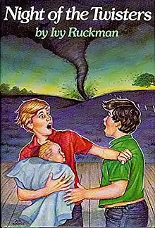 Night of the Twisters is a young adult realistic fiction novel by Ivy Ruckman that was released in 1984 by publisher Harper & Row (now HarperCollins). The book is a semi-fictionalized account of the 1980 Grand Island tornado outbreak, which produced seven tornadoes (including three that rotated anti-cyclonically) in and around Grand Island, Nebraska, on the evening of June 3, 1980, killing five people and injuring 134. It is told from the point of view of its 12-year-old protagonist Danny Hatch, who – after his home and neighborhood are destroyed by one of the tornadoes – begins a search for his parents as the event takes place.