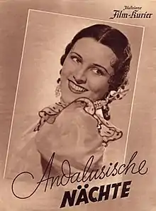 Nights in Andalusia (German: Andalusische Nächte) is a 1938 German musical film directed by Herbert Maisch and starring Imperio Argentina, Friedrich Benfer and Karl Klüsner.[1] [2] It is based on the opera Carmen by Georges Bizet, itself based on the novella Carmen by Prosper Mérimée. It was shot at the Babelsberg Studios in Berlin. The film's sets were designed by the art director Franz Schroedter. A Spanish-language version Carmen, la de Triana was made at the same time. The making of the film was an influence on the 1998 Spanish film The Girl of Your Dreams.