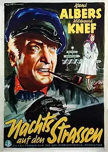 Nights on the Road (German: Nachts auf den Straßen) is a 1952 West German crime drama film directed by Rudolf Jugert and starring Hans Albers, Hildegard Knef, Marius Goring and Lucie Mannheim.[1] It was produced by the veteran Erich Pommer who had returned to Germany after years of exile. It is one of the more prominent German film noirs.[2] It was acclaimed by German critics on its release and was awarded a prize at the Berlin Film Festival.[3] It was shot at the Bavaria Studios in Munich and on location in Frankfurt and various autobahns. The film's sets were designed by Rudolf Pfenninger and Ludwig Reiber. The production budget was around 900,000 deutschmarks.[4]