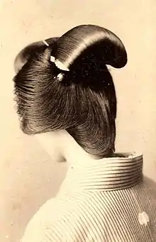During this time, a number of widely-varying hairstyles were developed and worn by Japanese women, with hairstyles commonly worn based on age, social class and occupation. One such hairstyle that developed during the Edo period was the shimada, which was commonly worn by girls in their late teenage years. The shimada became the basis for a number of popular hairstyles, such as the tōrōbin shimada (lit. 'lantern shimada'), which developed in the mid-Edo period; featuring wide wings at the side of the head, its name was said to refer to the fact that the area behind a person could be seen through the wings of a hairstyle, akin to being able to see through a tōrō lantern.[2] The tōrōbin shimada experienced wide popularity, and was commonly depicted in ukiyo-e prints by artists such as Utamaro.