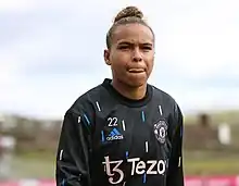 During the FA WSL Spring Series in early 2017, she scored three goals in the six games that she played.[17] Manchester City finished in fifth place with a 2–1–1 record.[17] She helped the club clinch the 2016–17 FA Women's Cup the same year.[28] During the 2017–18 FA WSL season, she was a starting forward in 17 of the 18 games she played and scored 11 goals,[17] ranking second in the league behind Ellen White of Birmingham City.[29][17] During the team's 3–0 win against Sunderland on 28 January 2018, she scored twice in the first half securing Manchester City's win and top position in the league.[30] She scored her second brace of the season against Liverpool on 11 February to lift Manchester City back into first place.[31] In May, she scored a hat-trick against Yeovil Town.[32] Manchester City finished in second place during the regular season with a 12–4–2 record[29] and secured a berth to the 2018–19 UEFA Women's Champions League (their third consecutive qualification).[33][34]