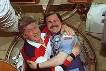 Cosmonauts Nikolai Budarin and Valery Ryumin (left) reunite moments after hatch opening, following docking of Mir and Space Shuttle Discovery.