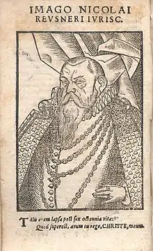 Nicolaus Reusner (also von Reusner, Reusnerus; 15451602) was a German jurist and publisher. He was born into a family of wealthy German landowners in Löwenberg, Silesia, who had recently moved there from Transylvania. Several members of his family became famous in the fields of law and medicine in the 16th century, including his brothers Bartholomäus von Reusner (1532–1572, medicine), Elias Reusner (1555–1612, history and medicine) and Jeremias von Reusner (law). Reusner studied in Wittenberg and Leipzig, under Modestinus Pistoris, and Leonhard Badehorn. In Leipzig, imperial personal physician Georg Wirth (1524–1613) persuaded him to abandon medicine and study law.
