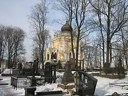 The cemetery was opened in 1863, to the east of the Cathedral of the Holy Trinity, the main church of the monastery.[1] It was the third cemetery in the complex, after the original Lazarevskoe Cemetery in the 1710s, and the Tikhvin Cemetery in 1823.[1] It was constructed on a space originally planned for a garden at the main entrance to the monastery, but that instead had become used for roads and palisades.[2] It was first called the Zasobornoye Cemetery (Russian: Засоборное), but became known as the Nikolskoe after the construction of the Church of St. Nicholas between 1868 and 1871 to the design of diocesan architect Grigory Karpov.[1][2] The church was funded by the wealthy merchant N. I. Rusanov, who established his family tomb on the ground floor.[3] The Spiritual Council noted that "the Lavra cemetery is not open to everyone, as are the city cemeteries, but only a few persons from the government service and persons with honorary titles are buried here."[2] Part of the cemetery also served as the burial site for the Monastery's monks and the metropolitans of Saint Petersburg, leading to the name Bratskoe (Russian: Братское), or "Brotherhood" section.[4]