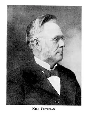 Nils Frykman (October 20, 1842 – March 30, 1911) was a Swedish teacher, evangelist and hymnwriter.[2] He came to the United States in 1888 and was a pastor at Covenant Churches in Illinois and Minnesota for nearly two decades. Known as "the joyous Christian singer", Frykman wrote over three hundred hymns, many of which are still sung by worshipers in Sweden and the United States.[3]