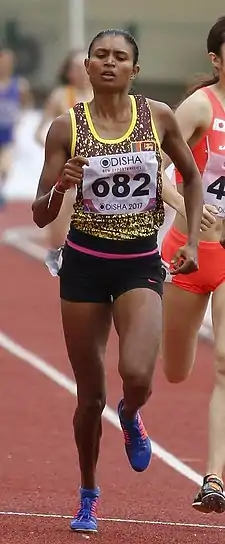 She also competed at the 2017 World Championships in Athletics in London, where she was eliminated in the preliminary round of women's 800m event after finishing with 2: 08.49 minutes. She also became the first Sri Lankan athlete to compete in women's 800m event at a World Athletics Championships.[21] The following year, she won the bronze medal behind the Chinese duo Wang Chunyu and Hu Zhiying at the 2018 Asian Indoor Athletics Championships in Tehran with a timing of 2:10.83 minutes.[22] She also represented Sri Lanka at the 2018 Commonwealth Games in the Gold Coast and was eliminated in the heat competing in 800m event with a timing of 2: 08.52 minutes.[23] At the 2018 Asian Games held in Jakarta she was eliminated after securing fourth place in the 800m heat event finishing with timing of 2: 06.74 minutes.[24]