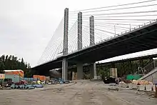 A $106 million project to replace the 1974 bridge began in 2013 as part of a region-wide project to widen the Trans-Canada Highway to four lanes. The cable-stayed design for the twin bridges, with two parallel spans carrying four total lanes, was to be the first of its kind in Ontario. The future westbound bridge opened on November 29, 2015; both directions of traffic were shifted onto the new bridge to prepare the old span for demolition. The eastbound span was scheduled for completion in 2017.[5][6] The eastbound span was completed in 2018, and the bridge fully opened to 2 lanes of traffic in each direction at the end of November, 2018.[7]