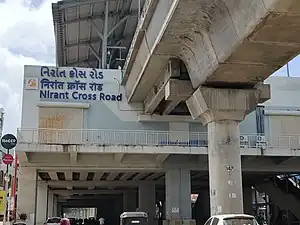Nirant Cross Road is an elevated metro station on the East-West Corridor of the Blue Line of Ahmedabad Metro in Ahmedabad, India. This metro station consists of the main Avadh Pride Shopping Complex, Ved Arcade Mall, the Municipality Garden (Vastral) and Arpan Vidhya Sankul (Vastral) school. This metro station was opened to the public on 4 March 2019.[1][2][3][4]