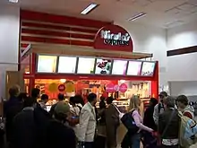 Expansion of the fast food business continued in the next two decades, with the opening of the ‘Central Kitchen’ and at the Chanakya cinema complex, Chanakyapuri, Defence Colony, Noida, Vasant Vihar, and various other locations in the NCR.[11] Before the arrival of several international restaurant chains in the 1990s, Nirula's remained a major draw for young people in the capital. In the following years, even after chains like McDonald's made inroads into its market share, Nirula's retained 40 per cent of the Delhi fast food market in 2000.[12][13] Facing stiff competition from Nirula's, McDonald's had to "Indianise" its menu to suit Indian palates, while for its part, Nirula's added competitive pricing and revamped its interiors.[3][4][14][15]