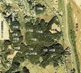 The Nishidani tumulus cluster is located on the Nishidani Hills facing the Hii River at an elevation of 40 meters, in the southeastern part of Izumo city. It consists of six Yosumi-tosshutsu-gata (四隅突出形)-style tumuli. This is a variation of the hōfun (方墳)-style square tumulus with polygonal-shaped protrusions on each of its four corners, a shape unique to the San'in region, as well as a number of other tumuli including 17 square hōfun and 4 circular empun (円墳) tombs.[2]