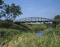 The Nishnabotna River Bridge is located southwest of Manilla, Iowa, United States. It carries traffic on 310th Street over the Nishnabotna River. Steel was in short supply during World War II as a part of the war effort.[2] Many bridges built across the state were built in this era with timber, especially small-scale bridges. Heavy flooding washed out 27 bridges and culverts in Crawford County in May 1945. The county board of supervisors used emergency funds to build new bridges. They bought several steel superstructures from the Des Moines Steel Company to replace the wash-out spans. The bowstring arch-truss structures appear to have been designed by H. Gene McKeown, a civil engineer from Council Bluffs. This bridge is one several similar structures built in the county, and one of five that still remain. The bridge was listed on the National Register of Historic Places in 1999.[1]