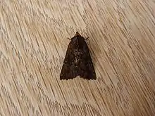 The wingspan is about 50 mm. Adults are brown with dark zigzag lines across the wings.