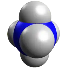Nitrogen pentahydride, also known as ammonium hydride is a hypothetical compound with the chemical formula NH5. There are two theoretical structures of nitrogen pentahydride. One structure is trigonal bipyramidal molecular geometry type NH5 molecule. Its nitrogen atom and hydrogen atoms are covalently bounded, and its symmetry group is D3h.[1] Another predicted structure of nitrogen pentahydride is an ionic compound, make up of an ammonium ion and a hydride ion (NH4+H−). Until now, no one has synthesized this substance, or proved its existence, and related experiments have not directly observed nitrogen pentahydride. It is only speculated that it may be a reactive intermediate based on reaction products. Theoretical calculations show this molecule is thermodynamically unstable.[4] The reason might be similar to the instability of nitrogen pentafluoride,[5] so the possibility of its existence is low. However, nitrogen pentahydride might exist in special conditions or high pressure. Nitrogen pentahydride was considered for use as a solid rocket fuel for research in 1966.[6]