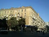 The second level of the architectural development of the street is connected to intrusion of new buildings in the middle of the 20th century, which were implemented in “empire” or so called “Stalin’s empire” style, known today as Stalinist architecture. Later, in the end of 1950s were constructed residential houses, many of which were projected and constructed in a new artistic architectural style which was widely spread in a lot countries of the world and which was known as “constructivism”. According to art critics H.F.Mammadov, architectural style of constructivism was shown fully and manifold almost in Baku in the whole USSR, where it was used for giving the city a new character. Enthusiasm for constructivism in Baku resulted in the creation of a local variety – “constructivism of Baku”.[21] As in earlier constructions, the architects introduced eastern and national tints, which are especially felt in implementation of arches and monograms of the buildings, which significantly changes the total stylistic appearance of these buildings and façade of the building is dressed with aglay.