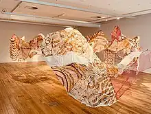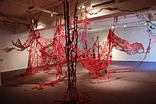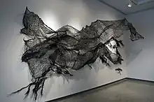 Nnenna Okoreⓘ (born 1975 in Canberra, Australia) is an Australian-born Nigerian artist who lives and works in Chicago at North Park University, Chicago.[1][2] Her largely abstract sculptural forms are inspired by richly textured forms and colors within the natural environment.[3] Okore's work frequently uses flotsam or discarded objects to create intricate sculptures and installations through repetitive and labor-intensive processes.[4] She learnt some of her intricate methods, including weaving, sewing, rolling, twisting and dyeing,[5] by watching local Nigerians perform daily domestic tasks.[1] In her more recent works, Okore uses plant-based materials (in particular, food scraps and food waste) to create large bioplastic art forms and installations.[6] Her work has been shown in galleries and museums within and outside of the United States.[1][5][7][8] She has won several international awards, including a Fulbright Scholar Award in 2012.[9] and the Australian Creative Victoria Award in 2021.[10]