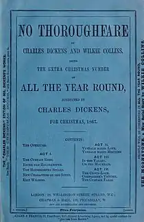 In 1867 Charles Dickens and Wilkie Collins collaborated to produce a stage play titled No Thoroughfare: A Drama: In Five Acts.[1] The two had previously collaborated on the play The Frozen Deep. This was the last stage production to be associated with Dickens, who died in June 1870. The play opened at the Adelphi Theatre on 26 December 1867.